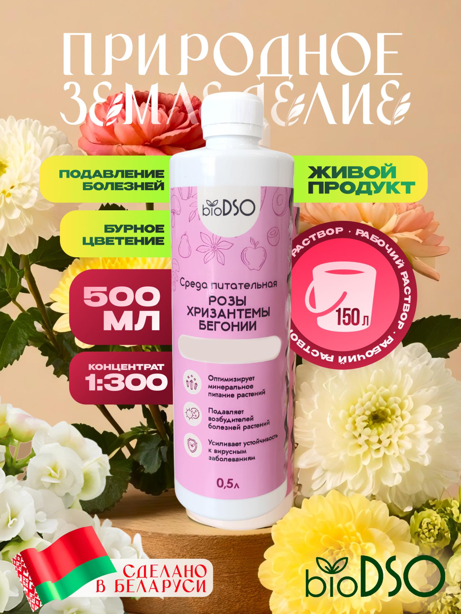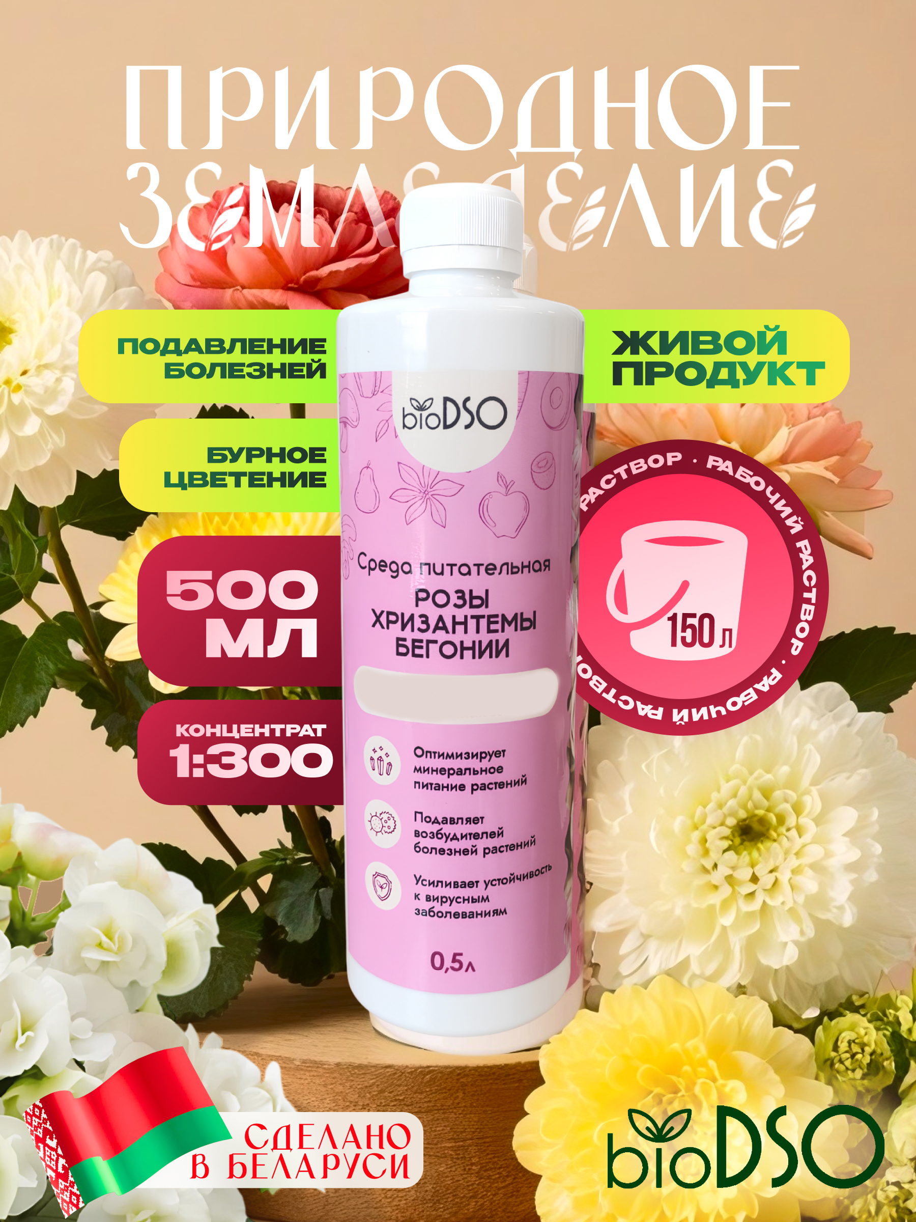 Среда питательная «Розы-Хризантемы-Бегонии» обогащает почвогрунты любого типа клетками консорциума полезной азотфиксирующей и фосфатмобилизирующей микрофлоры, а также грибов рода Trichoderma. «Розы-Хризантемы-Бегонии» активизирует рост растений, обладает широким спектром защитного действия, благодаря чему способствует подавлению возбудителей черной пятнистости, ржавчины, мучнистой росы. Усиливает устойчивость к вирусным заболеваниям.