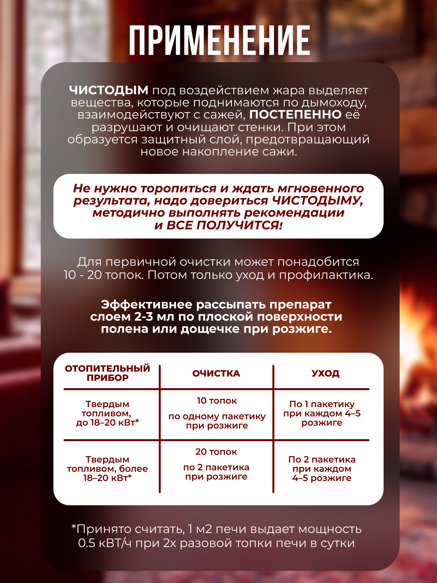 Под действием жара данный препарат выделяет специальные компоненты, которые поднимаются вверх по дымоходу при помощи тяги, вступают в реакцию с сажей и постепенно разрушают её, очищая стенки дымохода, а также покрывают их защитным слоем, который препятствует новому сажеобразованию.