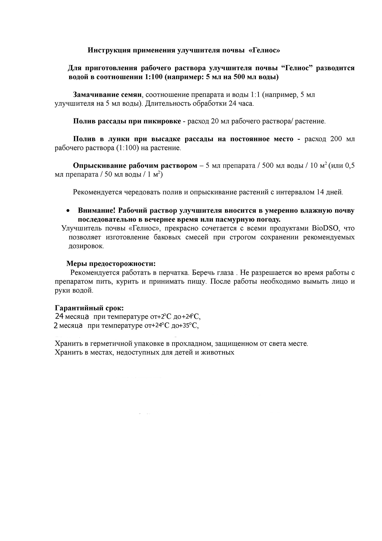 *Улучшитель почвы «Гелиос», прекрасно сочетается с всеми продуктами BioDSO, что позволяет изготовление баковых смесей при строгом сохранении рекомендуемых дозировок.